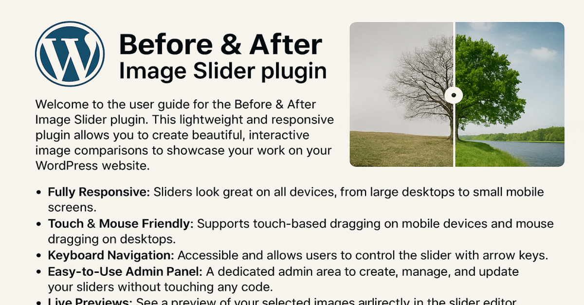 Welcome to the our Before & After Image Slider plugin. This lightweight and responsive plugin allows you to create beautiful, interactive image comparisons to showcase your work on your WordPress website. Whether you’re a photographer showing off editing skills, a designer displaying a redesign, or a clinic highlighting results, this plugin …