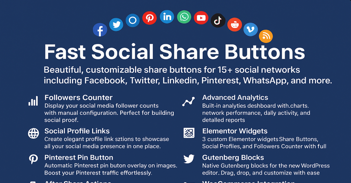 Fast Social Share Buttons is the only WordPress plugin you need to boost tweets, likes, and pins without slowing your site. One lightweight install gives you eye-catching share icons, live follower counters, one-click profile links, and the social proof that turns visitors into fans. No bloat, no upsells—just fast, fuss-free …